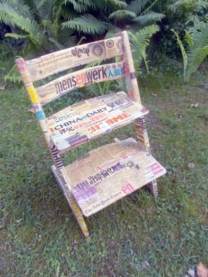 Stuhl "Multikulti", Papier auf Holz, Collage, 2015